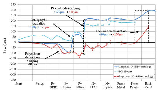Surprisingly, the bow during the N+ doping block is the same for the original and improved 3D-DS technologies. We cannot explain this behavior, but it illustrates the complexity of the stress in tridimensional structures. However, the improved technology fulfilled its role by reducing the wafer bow well below the 300 μm limit commented before.