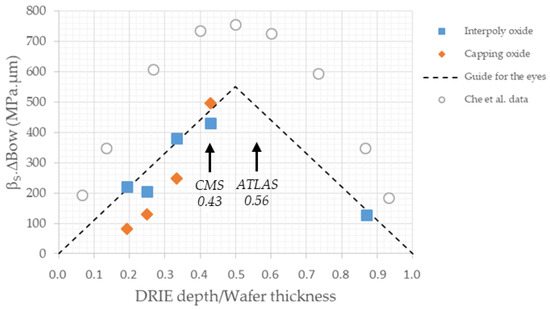Che et al. [47] were able to simulate by finite element analysis warpage of an 8-in 750-μm thick silicon wafer during via-last TSV processing. Several of their results are worth noting for 3D technology. Wafer warpage increases with increasing TSV diameter and decreasing TSV pitch. The first is related to active silicon thickness and maximum DRIE aspect ratio achievable; the latter is defined by design and physics consideration. Wafer warpage is maximum when TSV depth is half the wafer thickness, and decreases when TSV depth/wafer thickness ratio decreases or increases. This dependence could explain the differences in bow observed in the various 3D technologies. They plotted wafer warpage as a function of TSV depth (see Figure 22 in reference [47]). But this representation does not allow to compare wafers with different thicknesses. Therefore, we decided to plot instead the bow variation multiplied by the wafer rigidity βS (parametrized bow) versus the ratio of 3D column depth to wafer thickness (see Table 3 and Figure 19 below). Parametrized bow was referred to as stress-thickness product in planar technology when Stoney equation was valid.