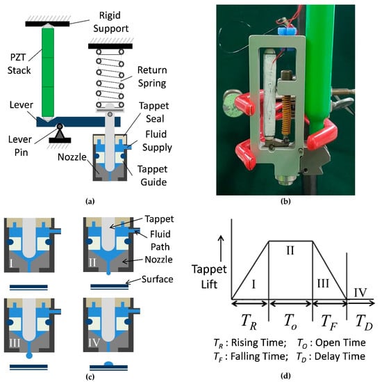 - Zhou, C.; Duan, J.; Deng, G.; Li, J. A Novel High-Speed Jet Dispenser Driven by Double Piezoelectric Stacks. IEEE Trans. Ind. Electron. 2017, 64, 412–419. [Google Scholar] [CrossRef]