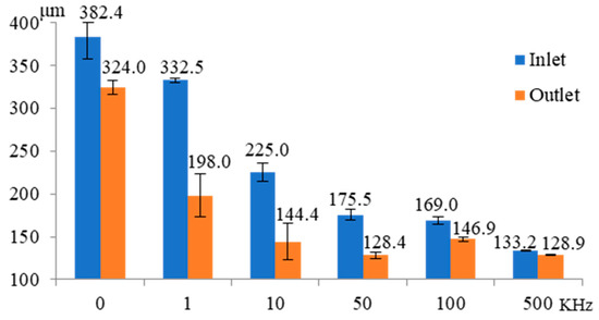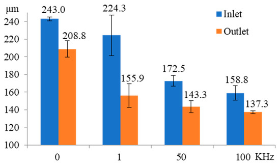 - When using micro helical electrode coated with the non-conductive mask in EMM, both the inlet and outlet dimension of micro through-hole decrease significantly under the condition of low pulse frequency (≤1 KHz). However, under the condition of high pulse frequency, the decline range of the inlet and outlet dimensions of micro through-holes is not obvious.