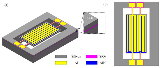 The designed even-order TPoS resonators were fabricated by using a foundry piezoelectric micromachining process through MEMSCAP. Figure 5 illustrates the cross-sectional schematic of the proposed fully-differential resonator with interdigital electrodes along A–A’ and B–B’. The total fabrication was a five masks process. In this fabrication process, a silicon-on-insulator (SOI) was used as the starting substrate (10 µm silicon, 1 µm oxide, 400 µm substrate). In this SOI wafer, the silicon layer was phosphorus doped as the ground electrode instead of a bottom metal electrode. Firstly, a thin thermal oxide layer (about 2000 Angstrom) was grown and patterned on the doped silicon layer. So the top metal electrodes at the tethers and anchor parts of the resonator were insulated from the doped silicon layer by this oxide layer rather than piezoelectric material. This treatment, replacing the piezoelectric material with the oxide layer, would avoid unwanted excitation at the tethers and help to further reduce anchor loss in turn. Then 500-nm thin film aluminum nitride (AlN) was deposited and patterned as the piezoelectric layer. A metal stack consisting of chrome (20 nm) and aluminum (1000 nm) was deposited by beam evaporation and patterned using lift-off process to define the pads, connecting wire, and top electrodes. The 10 µm silicon layer of SOI was etched using deep reaction ion etching (DRIE) to define the mechanical structure of the device. Finally, another DRIE process was used to etch the silicon substrate from the bottom side of the wafer to release the structure.
