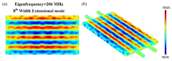 The eigenmode of the proposed resonator was investigated based on FEA (Finite Element Analysis) by using COMSOL Multiphysics software shown in Figure 3. The resonant frequency of the width-extensional (WE) mode resonator was determined by the width of the resonator (2L) and the properties of the multilayer material (aluminum, aluminum nitride, and silicon) that make up the TPoS resonator. The high-order width-extensional modes excited and sensed by interdigitated transducer resembled by patterned top electrodes, can be determined by: