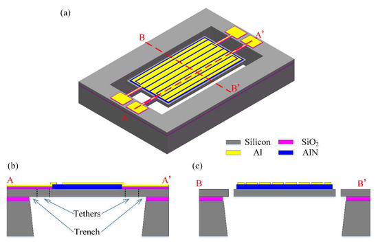 (a) The proposed resonator was fabricated using the MEMSCAP piezo micromachining process. (b) Illustrated cross-sectional schematic views indicated by the red dash line A–A’ show that there is a layer of oxide sandwiched between the metal transmission line and silicon layer for insulation. And the cross-sectional view schematic indicated by B–B’ illustrated in (c) shows more details about the electrodes and piezoelectric layer.