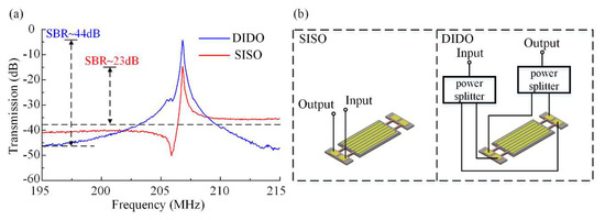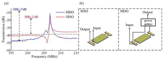 Measured electric transmission for a resonator operating in SIDO (blue trace) and SISO (red trace) setups. (a) The red trace is the result for SISO, and the response of the SIDO setup is shown as the blue trace. Measurement result for SIDO is better than that for SISO in both insertion loss and feedthrough suppression. (b) Measurement configurations of resonator operating in SISO and SIDO respectively.
