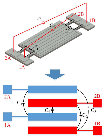 For further explanation, the interdigital electrodes of the resonator can be obtained in an equivalent simplified form to describe the feedthrough capacitance as shown in Figure 9. In this figure, ports 1A and 1B are input ports, 2A and 2B are output ports. Parasitic feedthrough capacitances exist between the respective input and output ports. In Figure 9, C1 is the feedthrough capacitance between the first pair of in-phase ports (i.e., input port 1A and output port 2A). C2 is the feedthrough capacitance between the second pair of in-phase ports (i.e., input port 1B and output port 2B). C3 and C4 are the cross-feedthrough capacitances between the input and output ports from the two pairs of ports. It will be observed that the configurations of input and output ports affect the degree of feedthrough cancellation and insertion loss. Three different setups are used to verify the effects of feedthrough cancellation by the differential configuration.