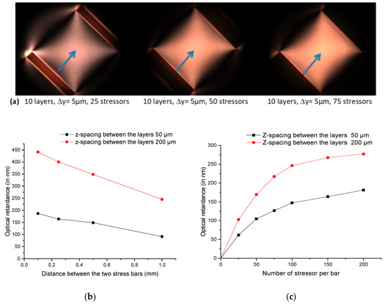 In the second set of experiments, displayed in Figure 1c, we changed the number of lines for a relatively large clear aperture of 1 mm, which allows one to consider the development of birefringent optics from this design. In this figure, the retardance values measured at the center between the two stress bars increase when the number of stressors increases. There is also a tendency for the retardance value to saturate when the number of stressors is greater than 100. The amplitude of the retardance reaches almost 180 nm for Δz = 50 µm layer spacing and 280 nm for Δz = 200 µm, which makes possible envisioning the production of both half and quarter waveplates in this configuration.