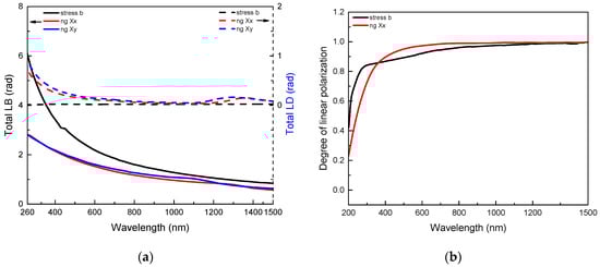 Figure 3a shows “Total LB” and the “Total LD” corresponding to the following equations: and . Note that these two properties are thus independent of the azimuthal orientation of the samples with respect to the polarimeter reference frame. Apart from the weak dichroic band around 1200–1400 nm which has been discussed in a previous publication [19], the anisotropic linear optical properties of the nanogratings waveplates (type a quarter waveplate at 500 nm) are mostly attributed to the formation of sub-wavelength nanolayers resulting in a strong form birefringence. However, there is also a contribution of stress-induced birefringence, which has been partly investigated in the literature [23,24,26,44]. We reported earlier that the spectral dependence of the optical path length difference expressed as is quite flat in the Vis and Near-IR spectral range, which results in an increase of with decreasing the probe wavelength, as it can be seen here. However, the measured LB dependence with the wavelength shows a steady decrease in the spectral region from 200 to 300 nm for Xx writing configuration and 200–400 nm for Xy writing configuration. This trend is expected by the effective medium theory as, at short wavelengths, the nanogratings period Λ approaches the probe light wavelength λ. In contrast, the TLB of the stress-engineered waveplate (a half waveplate at 450 nm) still follows a monotonous increase for decreasing wavelengths down to 200 nm, which allows, in principle, to imprint waveplates in the UV range.