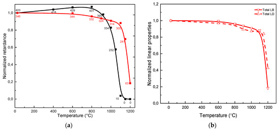 In agreement with the literature, the nanogratings-based waveplates (both Total LB and Total LD as shown in Figure 5b) can survive hours to temperatures higher than 1100 °C in SiO2 and typically erase for annealing treatments around the glass annealing temperature Ta (i.e., 1120 °C for SuprasilCG and with Ta defined as ŋ(T) = 1013 dPa.s−1). In contrast, we can observe the reduction of the stress-induced birefringence by a factor of two after 30 min of annealing at 1050 °C. This agrees with the expanded idea that an annealing at around 0.8–0.9.Ta (depending on the duration of the thermal treatment) should relax the stress-induced birefringence, as it is well known in glass manufacturing. Following this view, A. Čerkauskaitė [50] has demonstrated that annealing of nanogratings-based samples for 24 hours at 950 °C, 6 hours at 1000 °C, 2 hours at 1050 °C, and 1 hour at 1100–1150 °C “totally” eliminates the stress-induced birefringence. In contrast, since the annealing of nanogratings is governed by the slow decay term, the form birefringence remains after these thermal treatments.