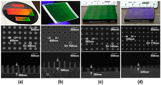 To fabricate the cross-sinusoidal AR nanostructure on a glass substrate via the imperfect glass imprinting process, a VC nanostamp with a HAR NPA was fabricated by the carbonization of an imprinted Furan precursor, as shown in Figure 1a–f. Figure 2 presents the images (top) and scanning electron microscope (SEM) images (middle: top-view, bottom: cross-sectional view) of the fabricated samples at each processing step.