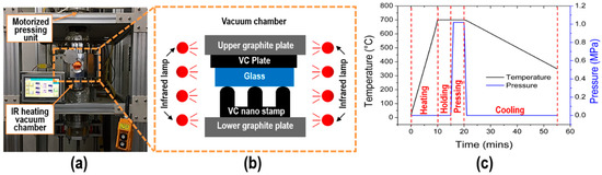 (a) Image and (b) schematics of glass imprinting system, in addition to set-up and (c) pressure and temperature histories of the glass imprinting process.