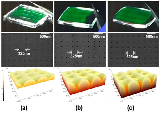 In this study, the influence of the imprinting temperature on the height of the glass imprinted cross-sinusoidal AR nanostructure was examined at a fixed imprinting pressure of 1 MPa. It should be noted that the HAR NPA on the VC stamp can be easily damaged during the glass imprinting process due to the low structural strength of the HAR NPA. After the preliminary glass imprinting experiments with the HAR NPA VC stamp, the imprinting pressure of this study was fixed at 1 MPa, which is the maximum allowable pressure for the prevention of damages to the HAR NPA on the VC stamp. Figure 4 presents the images (top), top-view SEM images (middle), and three-dimensional (3D) surface profiles obtained by atomic force microscope (AFM) measurements (bottom) of the cross-sinusoidal nanostructured glass substrates, which were glass imprinted at temperatures of (a) 680 °C, (b) 690 °C, and (c) 700 °C; with a fixed pressure of 1 MPa. The uniform diffraction color of the samples in the images clearly indicate that the uniform nanostructures were entirely fabricated on a glass substrate without defects. In the top-view SEM images, the uniform-stamped patterns with a pitch of 325 nm were observed. The 3D surface profiles obtained by the AFM measurements indicated that the cross-sinusoidal structures were fabricated via the imperfect glass imprinting technique. To qualitatively examine the influence of the imprinting temperature on the height of the cross-sinusoidal structures, the cross-sectional surface profiles of the cross-sinusoidal structures were compared, as shown in Figure 5. The measured heights of the cross-sinusoidal nanostructures were 35 nm, 55 nm, and 80 nm for the imprinting temperatures of 680 °C, 690 °C, and 700 °C, respectively. The heights of the glass imprinted cross-sinusoidal nanopatterns were gradually increased in accordance with an increase in temperature. Although samples with greater heights could be obtained at imprinting temperatures higher than 700 °C and pressures higher than 1 MPa, several defects were observed on the glass imprinted samples due to the broken NPA on the VC stamp during the releasing process. Therefore, the optimized imprinting condition was selected as the imprinting temperature of 700 °C and pressure of 1 MPa to fabricate the highest cross-sinusoidal nanostructure on the glass substrate without any releasing problem.