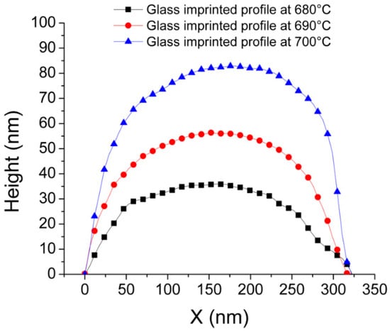 Comparison of cross-sectional surface profiles of glass imprinted cross-sinusoidal nanostructures at different imprinting temperatures.