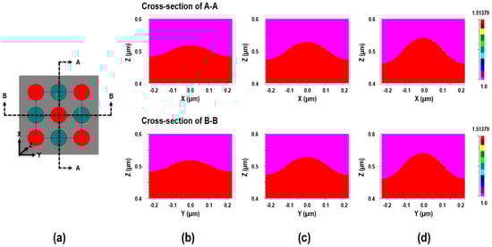 For the simulation of transmission spectra of the glass cross-sinusoidal nanostructure with different heights, a rigorous coupled wave analysis (RCWA) was conducted using commercial software (DiffractMOD, Rsoft, Synopsys, Inc., Mountain View, CA, USA). Based on the measured data of the glass imprinted cross-sinusoidal nanostructure, the 3D simulation models were constructed as shown in Figure 6. Figure 6a presents the top-view image of the 3D simulation model of the cross-sinusoidal structure, as generated using the Rsoft computer-aided design (CAD) tool. In particular, it was a combination of a positive cone structure (red), which represents glass (n = 1.5); and a negative cone structure (cyan), which represents air (n = 1), on a glass substrate (n = 1.5). The environmental material was set as air (n =1). Given that the pitch of the square-arrayed sinusoidal structure was 325 nm, and the diagonal distance between peaks was 460 nm; the x- and y-direction peak-to-valley distances (center of the positive cone and center of the negative cone) were set as 230 nm. The heights of the positive cone and depth of the negative cone were set as half of the measured heights of the cross-sinusoidal nanostructures (35 nm, 55 nm, and 80 nm). The dimensions of the simulation area were set as 460 nm × 460 nm, with repeated boundary conditions. Figure 6b−d present the A-A and B-B cross-sectional refractive index contour maps for the simulation models with total heights of (b) 35 nm, (c) 55 nm, and (d) 80 nm, respectively.