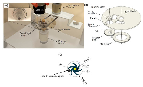 Centrifugal pumps are employed to transfer the fluid from a source (reservoir) to a desired position by converting the rotational kinetic energy of the fluid to hydrodynamic energy. In most cases, the rotational energy of the pump’s impeller comes from an electric motor or an engine that is connected to the impeller by a drive shaft. In this paper, a small-scale active centrifugal pump on the microfluidic CD is developed to pump the liquid towards the spinning center. However, instead of using an electric motor to drive the pump, magnetic force is utilized. As can be seen in Figure 1a, two main components are implemented: a dual-motor spinning system to spin the microfluidic CD, and a microfluidic CD with an integrated centrifugal pump made from polymethyl methacrylate (PMMA). The dual-motor spinning system was developed and discussed in detail in our previous paper [12]. Briefly, the dual-motor spinning system consists of two DC brush motors (primary and secondary motors) that are controlled simultaneously and accurately by a LabVIEW software (LabVIEW 2014, National Instruments, Austin, TX, USA). A hardware triggered high-speed camera (acA800-510uc, Basler, Ahrensburg, Germany) is used for live monitoring of the process. The primary motor is attached directly to the setup table and is used to spin the microfluidic CD. On the other hand, the secondary motor is inversely positioned on the setup table, using a custom-made holder. This motor is used to spin the main gear that is positioned coaxially under the microfluidic CD. The main gear is connected to the secondary motor using a rubber belt. It transfers the secondary motor rotation to the magnet-gear positioned coaxially below the chamber of the centrifugal pump (magnet-gear and pump impeller have the same spinning center-position) as shown in Figure 1b. The magnet-gear is attached to the microfluidic CD by a fixed shaft joint which is located below the pumping chamber. The impeller’s design is illustrated in Figure 1c. The diameter of the pump plays an important role in determining the flow rate in the channel, however, one of microfluidics’ aims is device miniaturization, and larger pumps might not be realizable on microfluidic discs.