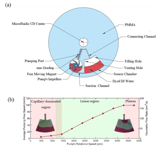 Haeberle et al. [23] enclosed an active pump that utilizes an external magnetic field to manipulate two integrated steel plates integrated on the microfluidic CD. Steel plates are mounted in a PDMS flexible layer and aligned on top of two chambers: a pump chamber, and a valve chamber. As microfluidic CD is spun at a specific frequency on top of the externally fixed permanent magnets, steel plates start to fluctuate in a specific frequency to achieve active pumping or valving mechanisms to continuously and efficiently pump liquid and air. In spite of the different advantages of this proposed method, increasing the pumping rate requires increasing the spinning speed of the microfluidic CD. This spinning increment can prematurely actuate other microfluidic processes, such as passive valves. In addition, the dragging force between permanent magnets and the mounted steel plates can interrupt the spinning speed stability of the microfluidic CD.