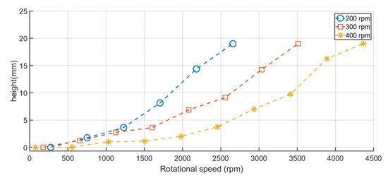 Experimental pump rotation speed vs. pumping balance points while the microfluidic CD is rotating at 200, 300, and 400 rpm.