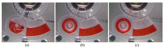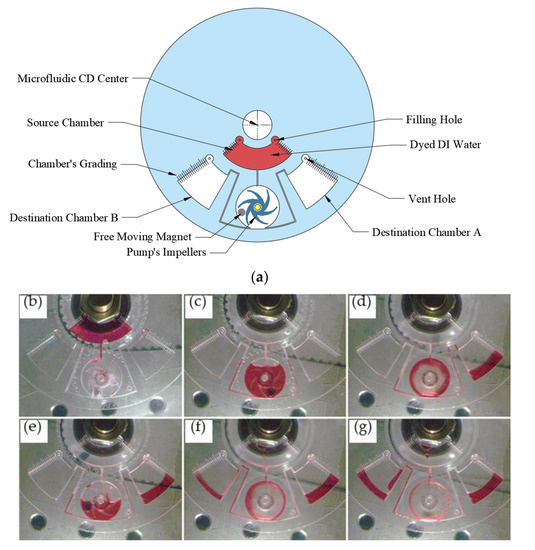 All the stages of the performed experiment are presented in Figure 9b–g. The process starts with loading the source chamber with 1000 µL of red-dyed water, then spinning the microfluidic CD at 250 rpm to transfer the liquid from the source chamber to the pumping chamber using the centrifugal force (Figure 9b). To pump half of the liquid to destination chamber A, the centrifugal pump is activated CCW at a speed of 1655 rpm (Figure 9c,d). To switch the flow towards destination chamber B, the speed and direction of the centrifugal pump are changed to 3560 rpm and the CW direction. The increase in the pump speed is due to three reasons: (1) the increase of the pumping distance that is longer compared to the previous stage (pumping toward chamber B; (2) the shape of the impeller’s vanes which are facing towards chamber A; and (3) the increase of air volume in the pumping chamber during the pumping toward chamber A. It was noticed that a small amount of liquid is always leftover in the centrifugal pump chamber which cannot be pumped at the implemented pump speed and microfluidic CD speed. To pump this leftover liquid, the microfluidic CD spinning speed was reduced from 200 rpm down to 100 rpm where the liquid was successfully pumped to destination chamber B.