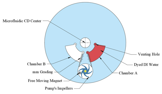 Most passive pumping methods have relied on the pneumatic force generated from compressing trapped air at high spinning speeds [15,16,17]. The compressed air can propel the liquid back towards the microfluidic CD center when the spinning speed is rapidly dropped to low or zero rpm. The limited volume of liquid that can be pumped by passive pumps at one cycle can be considered the main disadvantage of these methods. Therefore, active pumping methods were proposed to tackle some of the passive pumping limitations. For example, an external heating source (hot air, or UV light) was proposed to generate expansion for a trapped volume of air to pump a preloaded liquid towards the CD center [18,19,20,21]. However, this method can damage the loaded biological samples or reagents, and can cause deformation of the microfluidic CD materials when exceeding a specific threshold. To solve this problem, an externally focused airflow to pump the liquid inwards has been proposed [22]. However, this can be a massive source of contamination when used in a contaminated or outdoor environment.