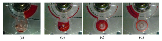 The experiment starts with loading chamber A with 1096 µL of red-dyed water which makes the top level of liquid reach the 14 mm grading. Afterward, microfluidic CD is spun and kept at 250 rpm to prime the microfluidic channel (reach burst frequency) where liquid transfers from chamber A to the pumping chamber. To pump the liquid towards chamber B, the centrifugal pump is activated at a range of speeds while the microfluidic CD continues spinning. The process can be reversed by simply stop the centrifugal pump to let the liquid flow back towards the pumping chamber and then activating the pump in the reverse direction to pump the liquid back to chamber A. Figure 7a–d presents pictures for the four main stages to pump the liquid from chamber A to B during the real experiment.
