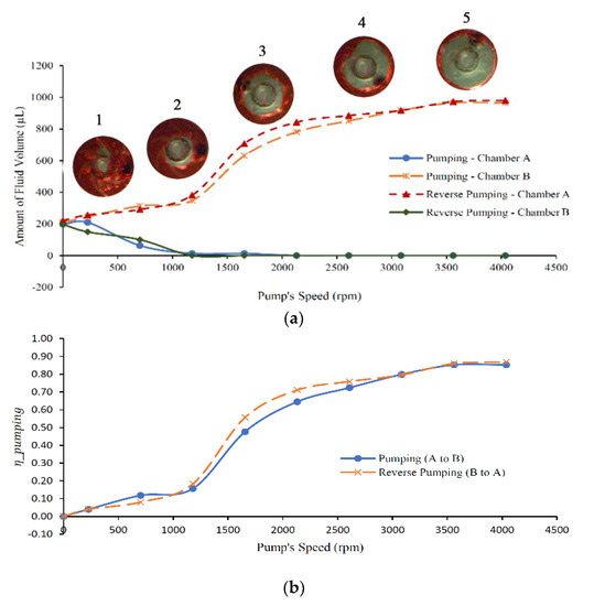 The experimental results of pumping at a range of pumping speed, and pumping efficiency are presented in Figure 8a,b. It is clear from Figure 8a that when the pump speed increases, the volume of liquid increases in the destination chambers (chamber B for pumping and chamber A for reverse pumping), while the liquid level decreases in the suction chambers for both processes (pumping and reverse pumping). The slope change from the 0–1179 rpm and the 1656–4038 rpm regions is due to the sudden change of the gas holdup inside the pump, as described earlier by Schäfer et al. [28]. The rapid change of the fluid from the bubbly regime to the intermittent regime is the main cause of this discontinuity [29]. Pumping chamber images 1 and 2 presented in Figure 8a show an asymmetric distribution of the gas phase (can also be seen in Figure 7c). On the other hand, images 3–5 describe the rotational speeds at which the pumped volume increased significantly and symmetric air distribution can be noticed. The discontinuity could be avoided by initially filling the pump with enough liquid to escape the critical gas volume fraction. Experimental results of pump efficiency shown in Figure 8b prove that the developed centrifugal pump can work in both directions, CW and CCW, in an almost identical pumping performance. The pump can reach a pumping efficiency of 87% when the pump speed is elevated to 4038 rpm. However, the pumping efficiency curve was calculated with the consideration that the accumulated liquid in the destination chamber is always subjected to centrifugal force due to the spinning speed of the microfluidic platform, and there is always a need for a higher pumping force for increasing the volume of pumping fluid. This could be overcome by connecting the pumping chamber and destination chamber by a siphon channel [30]. Some amount of liquid remains in the pumping chamber and cannot be pumped because the majority of the chamber would be filled with air by the time the liquid transfers to pumping chamber B (or to A in the case of reverse pumping), and the pumping efficiency decreases up to a point where it is not enough to pump any liquid. The connecting channels volume is also considered a dead volume since they are always filled with liquid that will not be pumped.