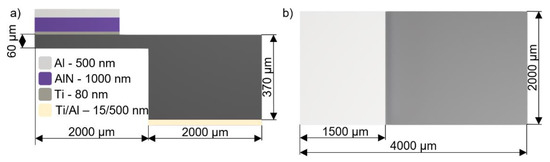 The fabrication was conducted using double-side polished Si (100) N-doped wafers with a diameter of ≈100 mm, thickness of ≈370 µm, and resistivity of <0.005 Ω∙cm. We deposited all sequential thin films, layer by layer (Figure 2a), using an ion-beam assisted deposition (IBAD) instrument, without breaking the vacuum between depositions. The wafers were loaded into the IBAD instrument and the system was evacuated to a base pressure of ≈9 × 10−7 Pa. Wafers were then pre-cleaned using a secondary ion-beam source with Ar plasma with 30 V beam voltage (BV), for a duration of 300 s. We then deposited ≈80 nm of Ti, serving as a seed layer for consequent AlN (001) deposition, as well as an electrical connection between the AlN and Si substrate. We activated the primary Kaufman ion-beam source, using a BV of 200 V, resulting in a (001) oriented layer of Ti [18,19]. This was followed with a change in the BV to 400 V and the addition of N2 to the primary ion-beam source, with a ratio of 1:1 to Ar. In addition, we employed the secondary ion-beam source for substrate bombardment, using N2 plasma at a BV = 30 V and performed reactive sputtering of highly (001) oriented AlN from the Al target, to achieve the desired thickness of ≈1000 nm [20].