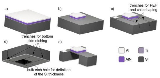 Figure 2. Fabrication process flow (not to scale): (a) Deposited layers on top side of Si substrate; (b) patterning of Ti/AlN/Ti/Al structure; (c) top-side trench etching using deep reactive ion etching (DRIE) method; (d) metallization followed by back-side etching causing separation of chips; (e) back-side etching, using DRIE method to form final structure.