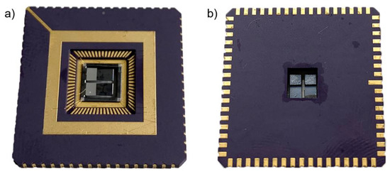 Finally, we cut a 4.5 × 4.5 mm2 hole, using an yttrium aluminum garnet (also known as YAG) laser into the center of the leadless chip carrier with 68 pads (LCC68). The individual chips were then mounted using silver conductive paste into the LCC68 (Figure 3a). The mounted chips had free vertical movement within the mass of the package (Figure 3b).
