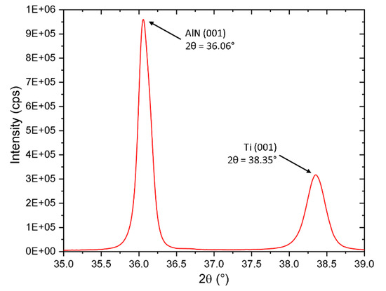 Deposited Ti and AlN layers were residual stress-free, which was determined from wafer curvature measurement. We also conducted the X-ray measurement using Bragg-Brentano setup to determine corresponding peak positions (Figure 4) for 2θ ≈38.35° for Ti (001) and 2θ ≈36.06° for AlN (001). These peaks positions also perfectly fit residual stress-free values determined from lattice parameters we published earlier [18,20]. Such prepared (001) oriented AlN exhibits a high value of piezoelectric coefficient d33 of (7.33 ± 0.08) pC∙N−1 along c-axis.