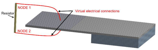 We performed finite element method (FEM) analyses of single clamped PEH using the ANSYS® Workbench with the Piezo and MEMS module. The model geometry was formed with a SOLID186 and SOLID226 3D element with a 20-node coupled-field, solid supporting piezoelectric analysis [21]. We performed coupled solution using an electrostatic and structural solver (Figure 5) via the piezoelectric matrix where {T} is the stress matrix, (c) is the elastic stiffness matrix, {S} is the elastic strain vector, (e) is the piezoelectric matrix, {E} is the electric field intensity vector, {D} is the electric flux density vector, and (εd) is the dielectric permittivity matrix.