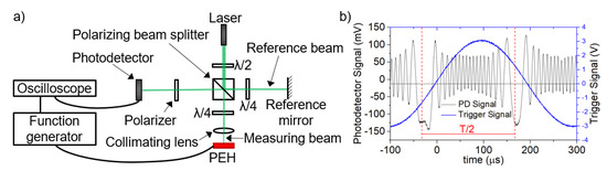 We chose the laser interferometer measurement as the first method for resonance frequency and displacement determination (Figure 7a). We used a diode-pumped solid-state laser with single longitudinal-mode operation and output wavelength (λ) of ≈532 nm. The interferometric setup employs a classic Michelson arrangement. Illuminating light enters the polarizing beam-splitter, where it is split into two beams: The measuring beam passes to the sample, where it is reflected with phase shift into the beam splitter and on to the detector; the second (reference) beam is reflected from a fixed-reference mirror. Both beams interfere at the detector, which converts the optical signal of the incident beams into an electrical signal that is displayed on an oscilloscope (Figure 7b). The voltage power supply, with an alternate current (VAC) and sinusoidal signal, was applied on PEH electrodes. Displacement of the PEH on z-axis (DZ) is proportional to the number of interferometric fringes between minimum and maximum amplitudes of the exciting signal, multiplied by λ/2.