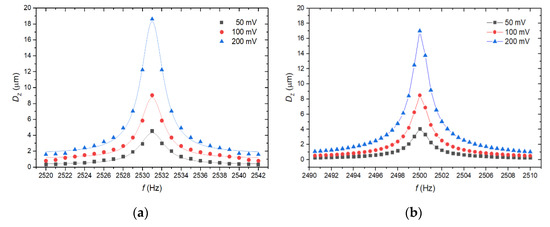 The VAC with a sinusoidal signal was applied on PEH electrodes. We adjusted VAC within a range of 0.05 V to 0.2 V. We observed the first fr at ≈2520 Hz, which agrees with results obtained by simulations with the corresponding value of ≈2500 Hz. The DZ obtained from the measurement at fr varied within a range of ≈4.5 µm to ≈18.2 µm for different VAC, this corresponded with measurement data for a range of ≈4.1 µm to ≈17.1 µm for the same VAC values. The dependence of measured DZ on frequency is shown in Figure 8a. The measured values of DZ correlate with values determined in FEM analyses in Figure 8b.