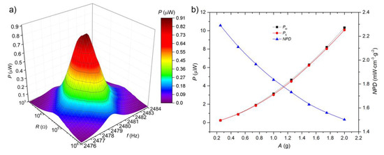 We observed a slight shift in fr in comparison to the fr determined during interferometric measurement. We changed the RL in the range from 100 Ω to 1 MΩ, with a logarithmic stepping for frequencies in a range of 2476 Hz to 2484 Hz with constant A ≈ 0.5 g. The optimized RL value of ≈67.56 kΩ was found for maximal generated PM of ≈0.91 µW at fr with A ≈ 0.5 g (Figure 10a).