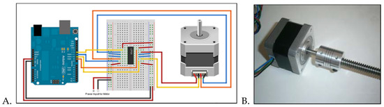 Device Assembly: The microfluidic platform was designed in SolidWorks (Dassault Systèmes, Vélizy-Villacoublay, France). From the calculations made in the Modeling section, the useful range of speeds is 0–200 rpm. Due to the lack of commercial availability of turntables in this speed range, it was decided that the device would be assembled using a stepper motor, which can supply the required angular velocity. The bipolar stepper motor (Stepperonline, Nanjing, China) is powered and controlled through an Arduino UNO (Digi-key Electronics, Minneapolis, MN, USA), as shown in Figure 1A. The stepper motor was connected to the Arduino through a motor IC driver, as shown in the diagram below (L293D DIP/SOP Push-Pull Four-Channel Stepper Motor Driver IC Chip, CNUS, Digi-key Electronics, Minneapolis, MN, USA). The speed of the motor was programmed in Arduino UNO (Digi-key Electronics, Minneapolis, MN, USA).