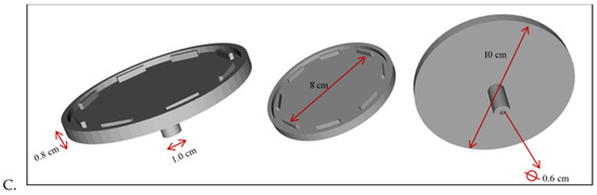The motor shaft (5 mm diameter) was then connected to a twisted screw via a coupler (Figure 1B) in order to be connected to a custom mounting plate designed in SolidWorks 2016 (Figure 1C). The mounting plate was designed to hold the polydimethylsiloxane (PDMS) microfluidic platform and connect the stepper motor’s lead screw to the microfluidic centrifugal device (MCD), fabricated using method described below. Figure 2 shows a Solidworks drawing of the microfluidic platform, alongside a micrograph, using Leica DM 5500B (Leica Microsystems, Buffalo Grove, IL, USA), of a section of the device.