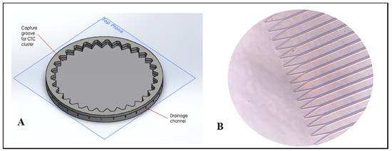 Figure 2. (A) CAD drawing of microfluidic centrifugal device (MCD) for circulating tumor cells (CTC) cluster capture and analysis. Note: Figure not to scale. The real device has a radius of 36.5 mm and a total of 1000 wells along the circumference. (B) Micrograph (20X) of individual traps and corresponding channels. Scale: 30 µm is the distance from one capture well to another.