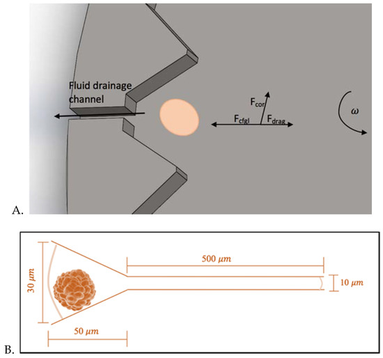 where n is the number of drainage channels and A is their cross-sectional area. Even though the problem was analyzed from a moving frame of reference, it was important to evaluate the fluid velocity in order to assess the shear rates on the cells. From computational analysis using COMSOL Multiphysics (Burlington, MA, USA), it was found that, for rotational frequencies below 50 rad/s, the maximum shear rates experienced by the cells are 398 s−1. This is a positive result, since cells are exposed to shear rates of similar ranges in vivo [14]. This modeling shows that at the calculated burst frequencies (ranging from 10–15 rad/s), the cells should be exposed to shear rates that are well within physiological limits. At these speeds, the cells should take between 5 and 25 min to reach their traps, as determined mathematically.