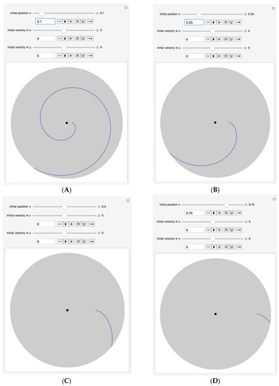Figure 5. Cell/bead path lines for various initial location of cells. (A) From Initial Position Ro = 0.4 cm; (B) From Initial Position Ro = 1 cm; (C) From Initial Position Ro = 2 cm; (D) From Initial Position Ro = 3 cm.