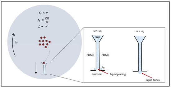 Based on these parameters we calculated the minimum value of ω c was found to be 15 rad/s (~150 rpm). Figure 6 shows schematic of liquid burst at the burst frequency. Finally, the average fluid velocity in the channel can be obtained by centrifugal theory and can be described as: