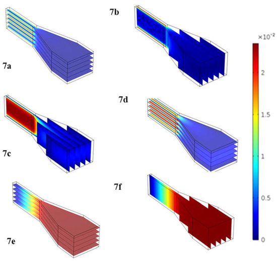 Figure 7. 3D Flow simulations generated in COMSOL Free and Porous Media Flow Package to simulate flow through the basic functional unit of the MCD (funnel-shaped trap and connected microchannel). We show shear rates (a,b), velocity (c,d) and pressure (e,f) profiles across one capture well and drainage channel.