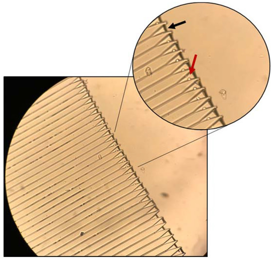 Experimental Investigation of the Centrifugal Device: Initial testing was performed with spherical polystyrene microparticles designed to mimic the density and size of our target cells. We evaluated 1 mL samples consisting of 2–150 beads/µL at rotational frequencies ranging from 150–300 rpm for time intervals ranging from 5 min to 25 min. Figure 8 shows an example of bead capture. This micrograph was taken with a Leica DM5500B (Leica Microsystems, Buffalo Grove, IL, USA)at 20× magnification after running the sample on the MCD for 15 min at 200 rpm. It is important to notice that, as predicted by the mathematical modeling of the cell’s radial path toward the trap, the particles rest on the side of the funnel-shaped trap (red arrow), rather than clogging the middle of the trap at the channel entrance. This indicates that the path taken by the particles is not solely radial, but curved as previously discussed. Additionally, it can be observed that the liquid level is at the entrance of each trap (black arrow). This is because the centrifugal pressure is not large enough to push the remaining fluid through the drainage channel. Since the liquid is never fully drained, the trap’s content remains submerged even after drainage. This result is important when considering that this chip was designed to host live cells, not beads. The cells require liquid environments and would suffer osmotic imbalances if the fluids were to be completely drained.