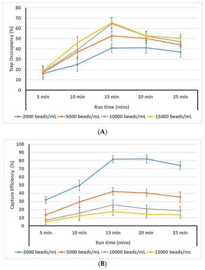 Figure 9. (A) Trap occupancy rate vs. run time for different loading concentrations. (B) Bead capture efficiency vs. run time for different loading concentrations.