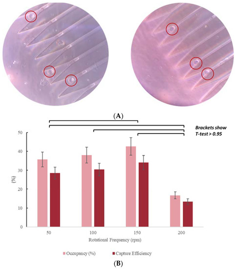 The efficiency increased with increasing rotational frequency until a frequency of 150 rpm is reached. Beyond 150 rpm increased frequencies caused decreased capture rates (Figure 10). Reduced capture at high rotational frequencies is likely a result of more frequent cell lysis under higher shear stress. This hypothesis was confirmed by the presence of uncharacterized debris observed in the MCD following assays run at ω o > 150   rpm . Therefore, 150 rpm was selected as the optimal rotational frequency to provide high capture efficiency. At 150 rpm for 15 min, the trap occupancy was found to be 42%, with a corresponding capture efficiency of 34%.