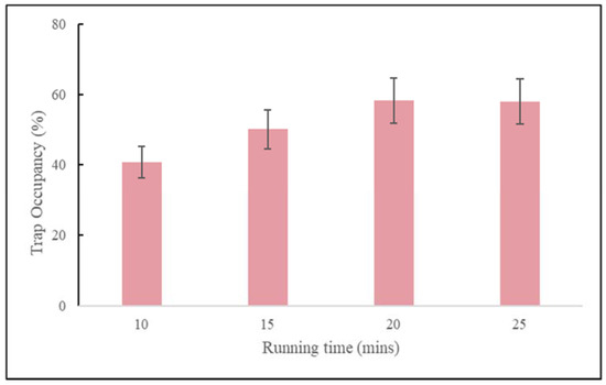 Figure 11. Occupancy rate as functions of running time (mins) for MCF-7 cells loaded at a concentration of 5000 cells/mL, at an operating rotational frequency of 150 rpm.