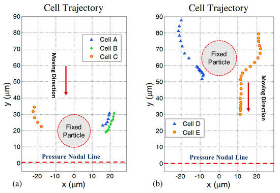 To investigate the motion behavior of cells in close proximity of fixed silica particles during acoustic exposure, different experiments were performed. In Figure 2 the trajectories of RBCs in the horizontal x-y plane initially located in the proximity of fixed silica particles are shown from five repetitions of the experiment. In Figure 2a, the position of silica particle is constant during three different tests. To compare RBCs trajectories with each other we show them in the same picture. Figure 2b also shows two cases with the same silica particle position. In both Figure 2a,b, the pressure node is in the middle of the channel and located below (line y = 0) the fixed silica particle, while the RBCs start moving from the upper side. High deflection in the RBCs’ trajectory (along the x direction) in the vicinity of fixed particle can be seen clearly while there is no contact between cells and the silica particle. In almost all cases, the center-to-center distances between cells and silica particles are about 20 to 25 µm and in three out of five cases the secondary acoustic force is strong enough to stick RBCs to the fixed silica particle, near θ = 90° (where θ is the angle between centerline of cell-silica particle and wave propagation direction in the one-dimensional standing wave). In our case, results show that when the silica particle is located in between the pressure nodal line and up to about 50 µm from this line, all the RBCs (N = 4) stick to the silica particle. Farther away from this zone the ability of trapping RBCs gradually gets weaker. In the region close to the channel wall we observed pathway deflection without sticking cells. In the region far from the pressure nodal line the monopole term of the secondary acoustic force is dominating and the probability of sticking of a RBC to a silica particle is minimum as compared with the case when the silica particle is located close to the pressure nodal line where the dipole terms of secondary acoustic force is dominating. Additionally, it should be noticed that the primary acoustic radiation force close to the pressure node reduces dramatically and this causes a perfect condition for secondary acoustic radiation force-dependent cell trapping to silica particles. Furthermore, as shown in the figure cells with the same initial position undergo the same deflection behavior, which is quantitatively in agreement with the Gröschl theory and also in agreement with the experimental reproducibility obtained in [27]. It can be seen in the figure that the pathways of the RBCs are almost straightforward along the y-axis before and after they get close to the fixed silica particle.