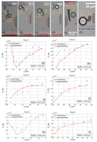 Time series of RBC pathways (a–f), cases 1 to 6, respectively, and experimental and theoretical comparison of the secondary acoustic force while RBCs pass by a fixed 20 µm silica particle based on the extended Gröschl model (g–l). Standard deviations of the residuals were shown for each case (root mean square error, RMSE). In (c,e), the pressure nodal line is outside of the picture. In (f) the channel wall is outside of picture. The center of the fixed silica particle in (g,i) is located at 65 µm, in (h,j,l) at 20 µm, and (k) at 128 µm from the pressure nodal line (the latter set to y = 0).