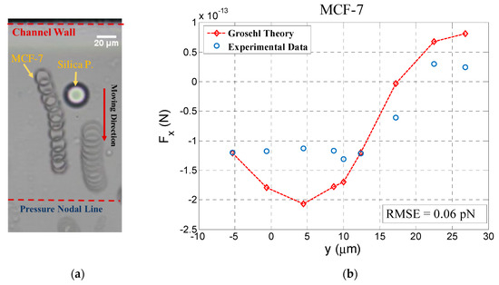 Time series of MCF-7 pathways while moving close to the fixed silica particle (a), and comparison of experimental data of the secondary acoustic force between a MCF-7 cell and silica particle with the extended Gröschl model (b). Here, the center of the fixed silica particle is located at 108 µm from the pressure nodal line.