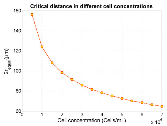 Here, the center-to-center distance between two neighboring particles in a uniform distribution is equal to 2 . If the particle concentration is chosen in the range that results in particle–particle distances larger than a critical distance, we can expect less interaction between cells or particles due to the secondary acoustic force. Considering the cell line MCF-7 with a typical diameter of 20 µm, we found by analyzing our experimental data that this critical distance is about 80 µm for MCF-7 cells and about 35 µm for RBCs, in proximity of a silica particle. By calculating for different cell concentrations and comparing this distance with the critical distance, we can estimate the degree of cell–particle interaction due to acoustic forces. Figure 5 shows as an example the relation between cell concentration and for MCF-7 cells. As shown, at MCF-7 cell concentrations larger than 3.5 × 106 cells/mL, becomes smaller than the critical distance 80 µm and we can expect that the secondary acoustic force would be of relevance for the acoustophoretic function. Considering a non-uniform cell distribution resulting in a locally smaller , the secondary acoustic force could be of even larger relevance.