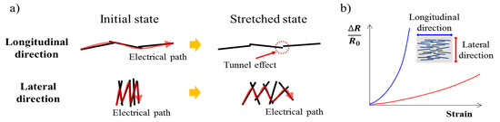 Working principle of the proposed strain sensor. (a) Working principle of the longitudinally and laterally aligned strain sensors. (b) Graph for predicting the resistance change rate according to the strain of the fabricated strain sensors.