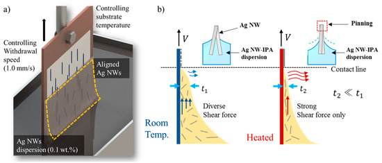 The principle of alignment of the silver nanowires. (a) Process schematic. (b) Principle of the alignment of silver nanowires in the temperature-controlled dip coating process.