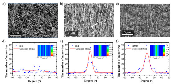 Comparison of the degree of alignment of silver nanowires. (a) SEM image of unaligned silver nanowires. (b) SEM image of the silver nanowires aligned using the temperature-controlled dip coating process. (c) SEM image of the silver nanowires transferred to the PDMS. (d) Analysis of the degree of alignment of unaligned silver nanowires. (e) Analysis of the degree of alignment of silver nanowires aligned using the temperature-controlled dip coating process. (f) Analysis of the degree of alignment of the transferred silver nanowires. Insets of (d–f) show the distribution of nanowires according to the angle, and the amount of silver nanowires is expressed in color.